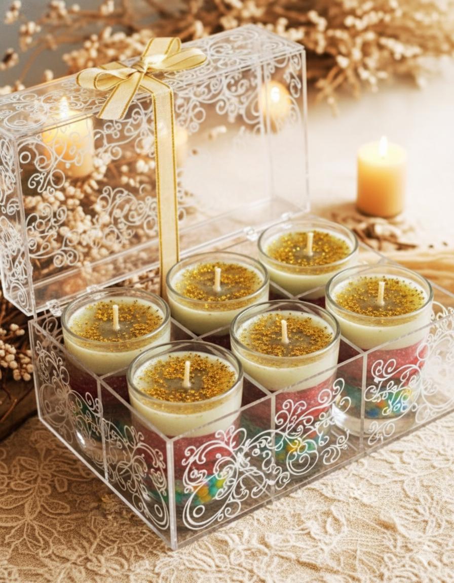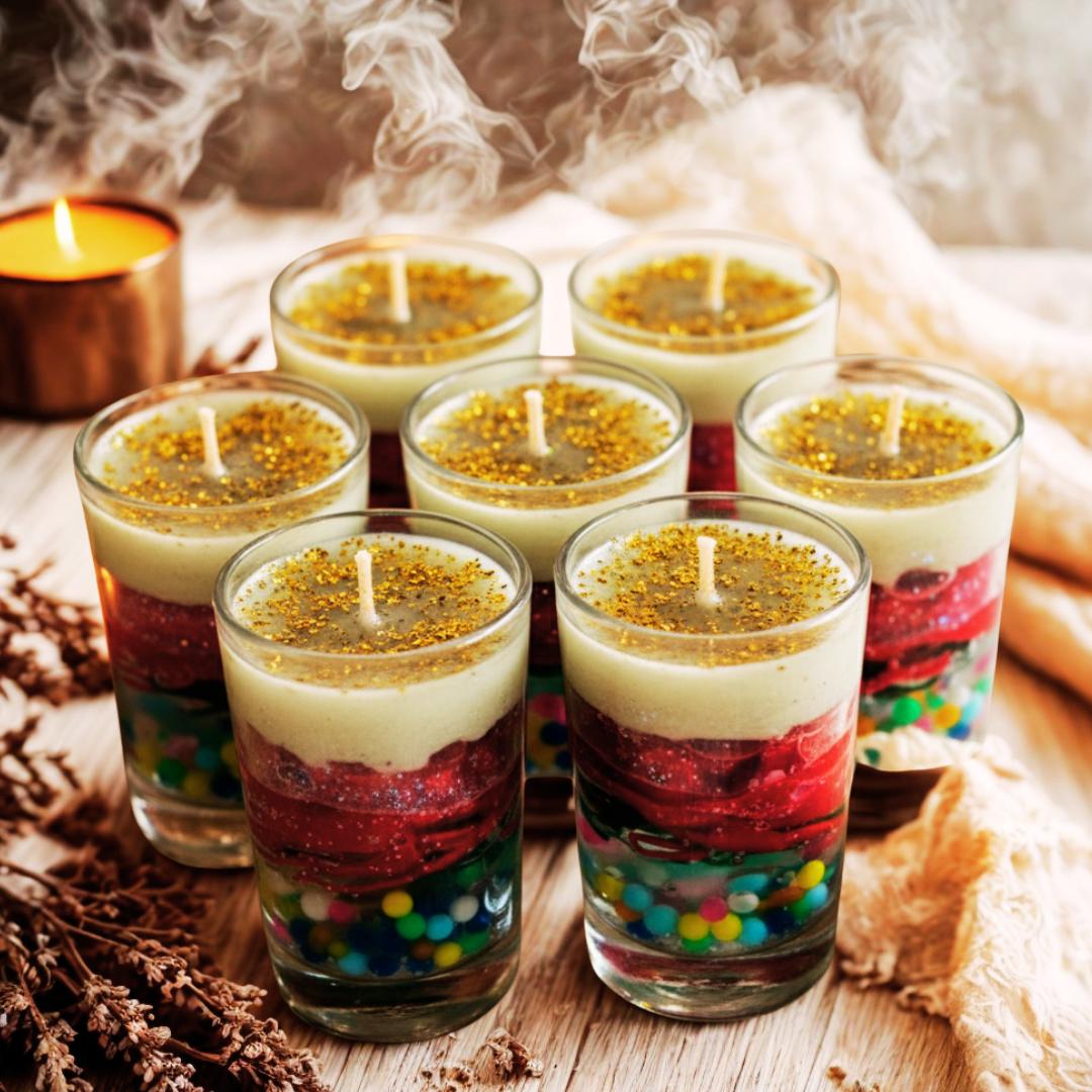 Brighten up your celebrations with these beautifully handcrafted layered candles! Each candle is artistically designed with colorful beads, rich wax layers, and a golden glitter top — creating a luxurious and festive charm. Perfect for gifting or decorating your home this Diwali, these candles add a warm glow and a touch of elegance to every space.