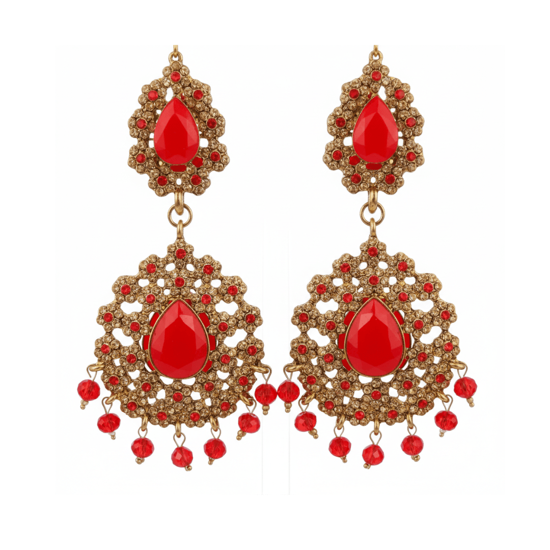 • Superior Craftsmanship: Featuring intricate gold-toned filigree work, these earrings are adorned with vibrant red teardrop centerpieces and shimmering micro-crystals.