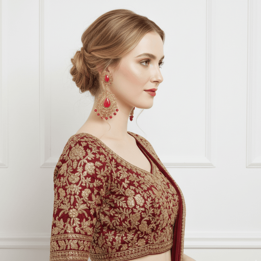 • Traditional Meets Modern: Inspired by classic Kundan and Jhumka designs, the bold red accents and hanging bead tassels provide a rich, luxurious look.