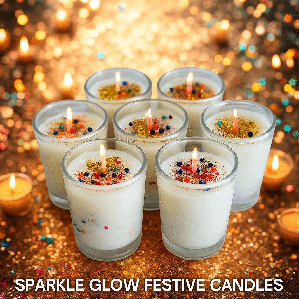 Add a magical touch to your celebrations with our Sparkle Glow Festive Candle. This elegant glass candle features a white wax base adorned with colorful beads and shimmering glitter, creating a stunning glow when lit. Perfect for Diwali décor, parties, or gifting, it brings warmth, brightness, and festive charm to any space. Each piece is handcrafted to make your moments shine brighter.